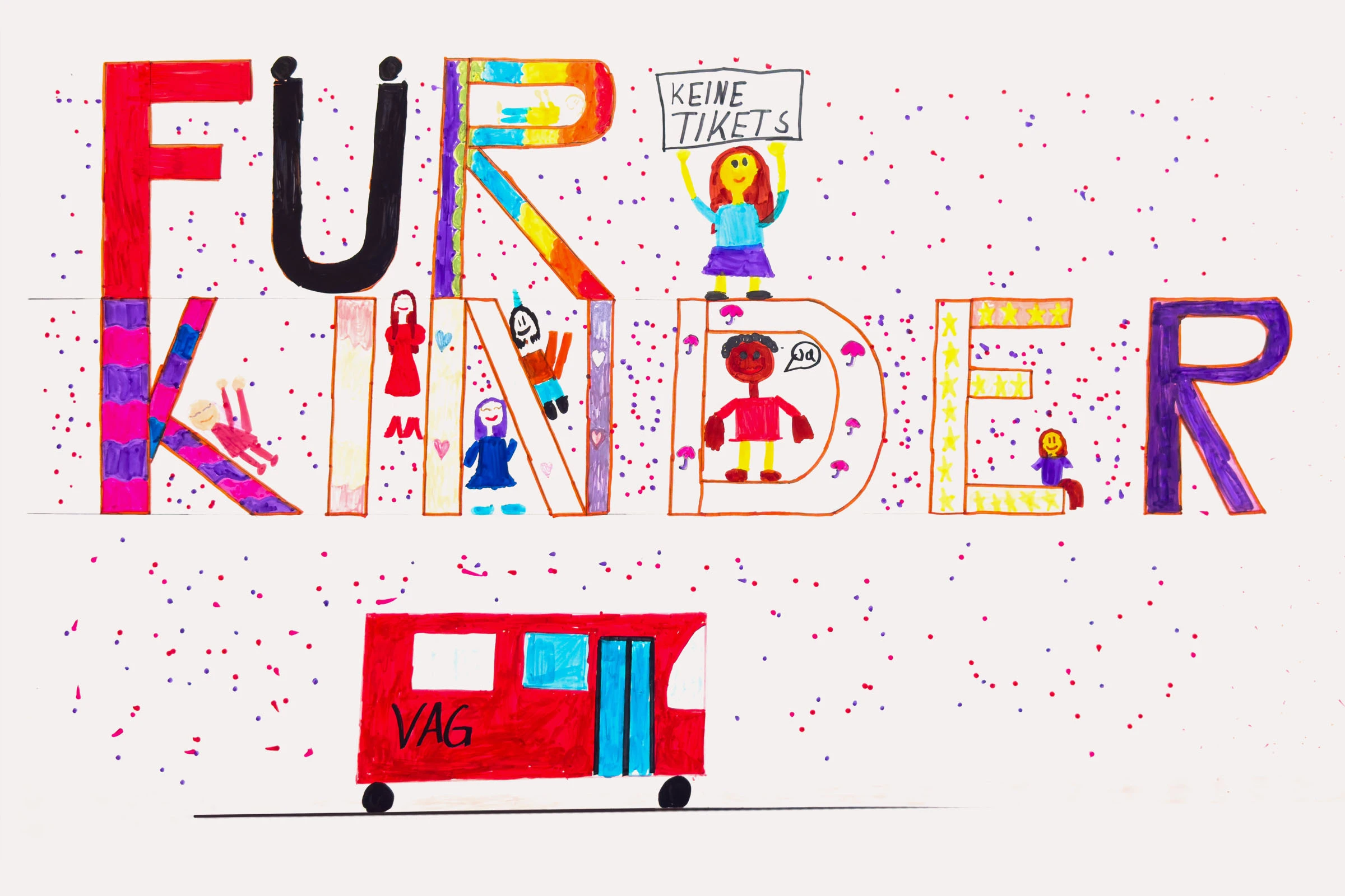 Im AWO-Hort Martin-Bächer-Kinderhaus haben Kinder Plakate gemalt, um ihre eigenen Wünsche sichtbar zu machen. Auf diesen Motiven stehen Botschaften wie „Freie Fahrt“, „0 € Kinderticket“ und „Für Kinder“. Die Motive sind jetzt auch als Großflächenplakate in der Stadt zu sehen.